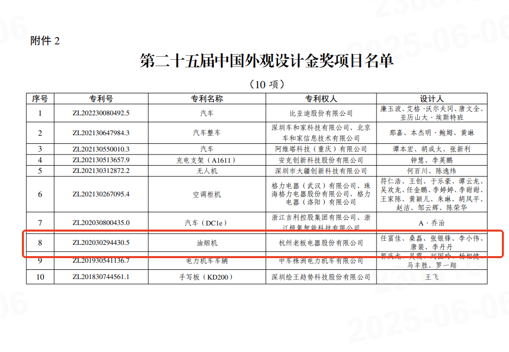 近日,中国厨电领域传来振奋人心的消息——老板电器旗下的一款旗舰吸油烟机凭借其独具匠心的外观设计,成功斩获第二十五届中国专利金奖。这是老板电器继2018年首次荣获该奖项后,再度将这一中国知识产权领域的至高荣誉收入囊中。至此,老板电器成为厨电行业中唯一两次获得此项殊荣的品牌,以强大的科技创新实力,为行业树立了全新的技术标杆。